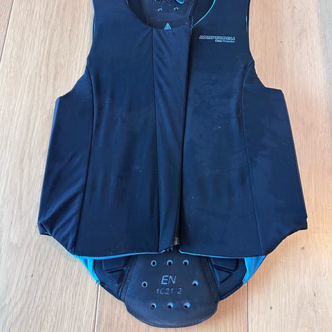 Str 128, brugt af min datter fra hun var ca 140-150cm høj (da rygskjoldet ikke skal ramme sadlen når de rider går de str ned). Elastisk materiale.