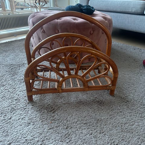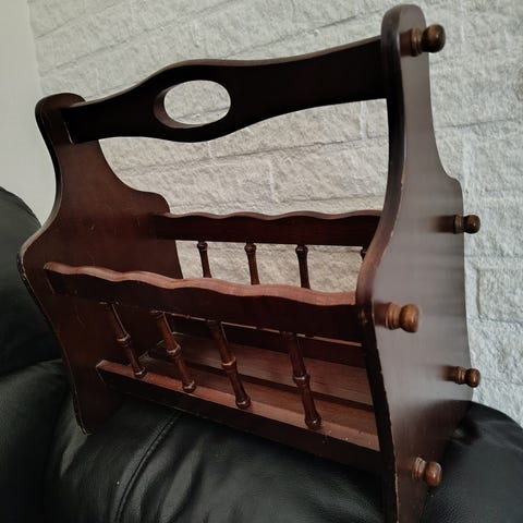 Rigtig fin magasinholder i lærred og fyrretræ.