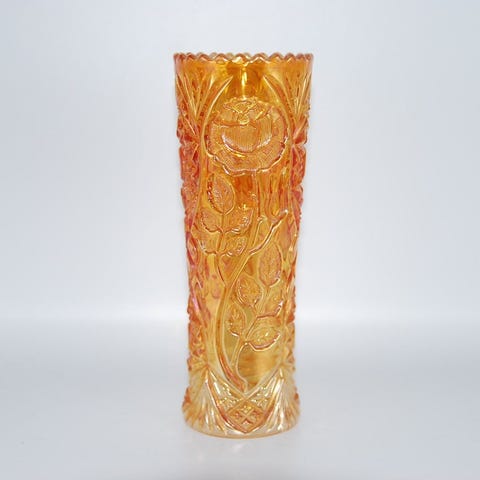 Sød rund orangefarvet glasskål. Producent ukendt. Carnival glas, eller også omtalt som auroraglas, har en slags iriserende glimmer på overfladen, som er ret smuk. Diameter 17 cm.
