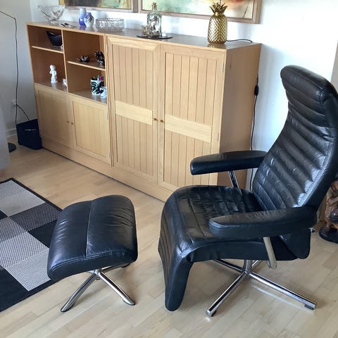 Pæn designstol. Bygget efter patentudløb på Le C. Lidt løs i elastikker, men stadig funktionel. God liggestol til læsning.