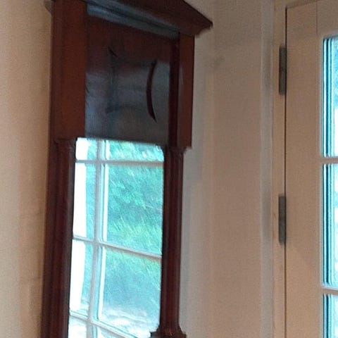 Antikt spejl med brun mahogni træramme. Spejlet har en markant, høj ramme med dekorative detaljer og søjleformede sider. Rammen er udført i træ med mørk, varm finish. Egnet til ophæng eller placering i entré, soveværelse eller stue, hvor der ønskes et større spejl med klassisk udtryk.