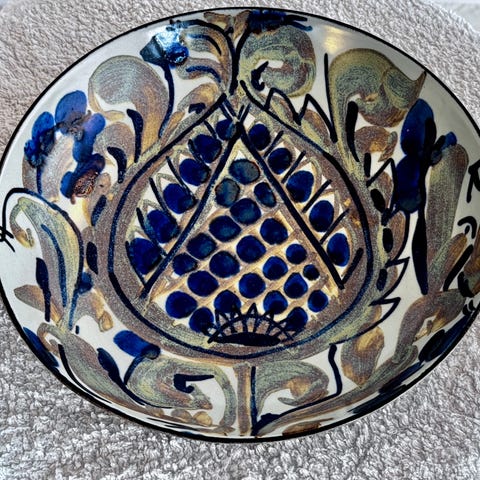 Charmerende skål fra Royal Copenhagen. Denne fajance Tenera-skål, model nr. 140-2882, er designet af den talentfulde Beth Breyen. Skålen måler 11 x 11 cm og prydes af et smukt mønster i blå og lilla nuancer.