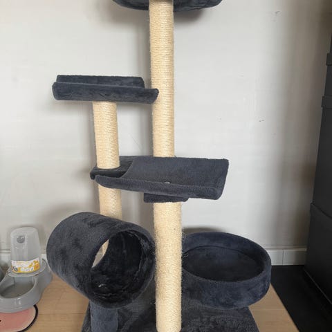 Klatretræ til kat med firkantet bund med hule og rund indgang.