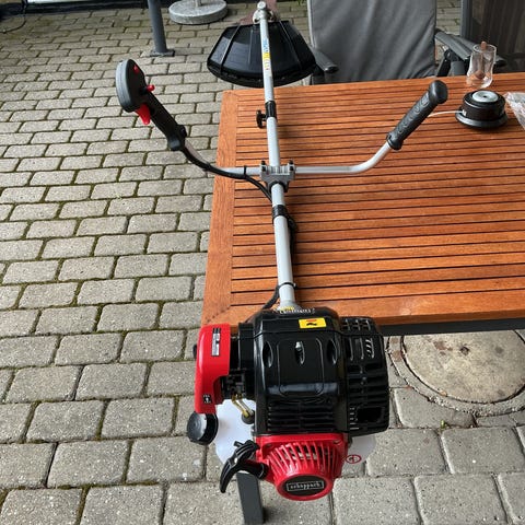 Scheppach MFH420-4F havemaskine 4-i-1 benzindrevet. Sættet fremstår som et multifunktionsredskab til havearbejde med flere udskiftelige hoveder. Ud fra billederne omfatter det blandt andet trimmerhoved, klinge og beskyttelsesskærm samt bæresele. Der medfølger desuden manual og kvittering fra Harald Nyborg samt dunke med brændstof/olieblanding. Velegnet til forskellige typer trimning og rydning i haven afhængigt af monteret tilbehør.