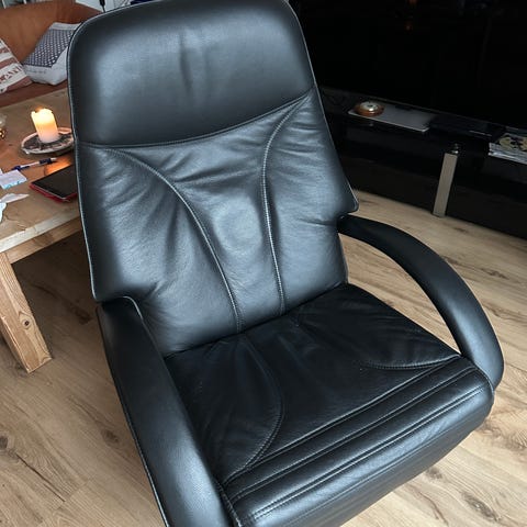 Lænestol, læder, Berg Dream Balance Milance, Drejefod med vippesystem med automatisk udfoldbart fodstykke samt pumpe til ryglæn. H. 110 cm. B. 74 cm. Nypris 17.000 DKK.
