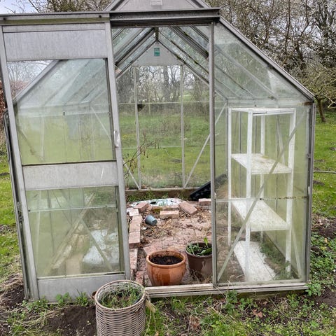 Drivhus med glasvægge og plast i taget samt aluminiumsstel (ingen bagside)