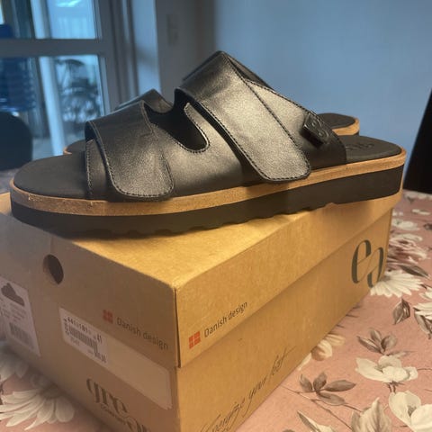 Fidelio sandaler i størrelse 41. Åbne sko med flere remme og justerbar lukning. Sandalerne er i sort farve med lys inderside og egner sig til hverdagsbrug. Velegnet som komfortable hverdagssandaler.