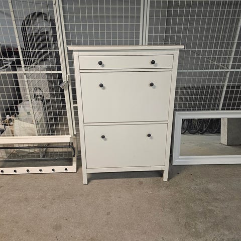 Sælger dette flotte og udgåede Hemnes skoskab fra IKEA. Det er i god stand og har fået nye fine greb på. Det måler 89x30x127 cm. To rum til sko og en skuffe til nøgler eller andet.