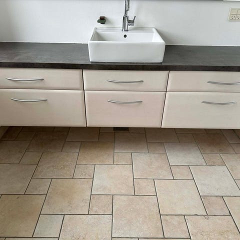 Vasken er indbygget i en hvid bordplade med udskæring til armatur, meget brugt. Inkl. armatur som er meget tilkalket men virker fint.