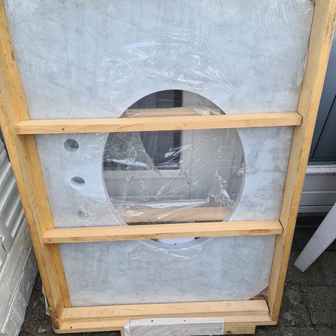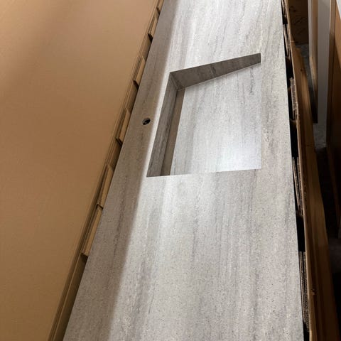 Bordplade, Marmorline bordplade i marmorlook med integreret vask i rigtig praktisk løsning. Uden fare for at vandet løber mellem bordpladen og vasken ned i skabet, og hele bordpladen kan tåle at komme i kontakt med vand. Er nem at rengøre.