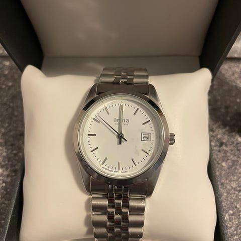 IRMA Unisex armbåndsur med rustfrit stålrem og hvid urskive. Uret har sølvfarvet metal lænke med foldelås. Analoge timemarkeringer og datoangivelse på urskiven. Egnet til mænd og kvinder, der ønsker et enkelt og tidløst armbåndsur til daglig brug eller mere formelle anledninger. Bagpå er indgraveret tekst med årstal 1986-2011 og 125 år, hvilket indikerer en jubilæumsudgave.