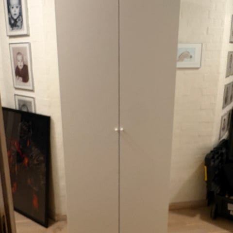 Her er der plads til det hele, højt og rummeligt skab med hvid låge i højglans. Lågen er fin og uden mærker, der er lidt skrammer på skabets sider. Masser af hylder følger med.