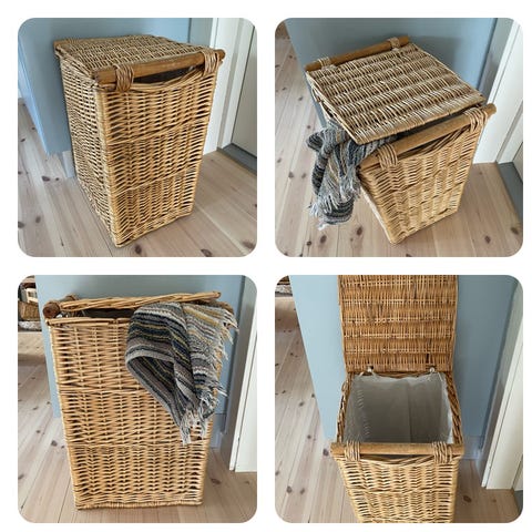 Vasketøjskurv i flettet materiale med låg. Kurven har udtagelig stofpose indvendigt, som gør det nemt at transportere indholdet.