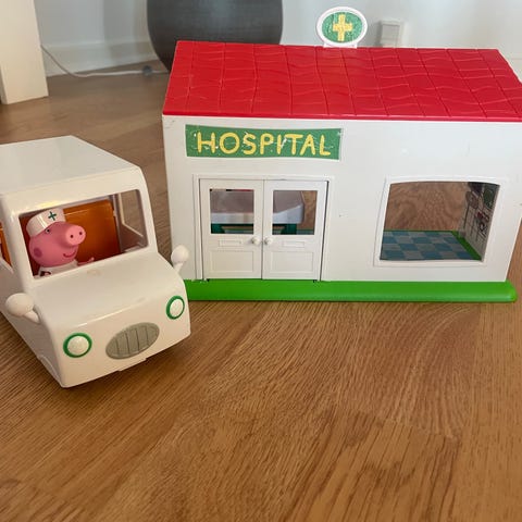 Gurli Gris ambulance legetøjssæt med ambulancebil, lille klinik/venteværelse, båre og tilbehør. Sættet inkluderer figurer, der forestiller en læge og en patient fra Gurli Gris universet. Plastlegetøj velegnet til rolleleg med hospitals- og lægetema.