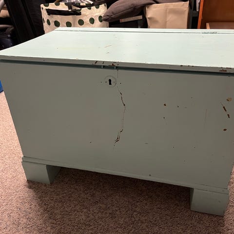 Trækiste i brunmalet træ med buet låg og påsatte metalbånd. Kisten har bærehåndtag i metal i siderne samt låsebeslag på fronten. Indvendigt er der ruminddeling med flere mindre fag i den ene side og et større opbevaringsrum. Velegnet til opbevaring af tekstiler, legetøj eller andre genstande samt som dekorativ møbelgenstand i boligindretning.
