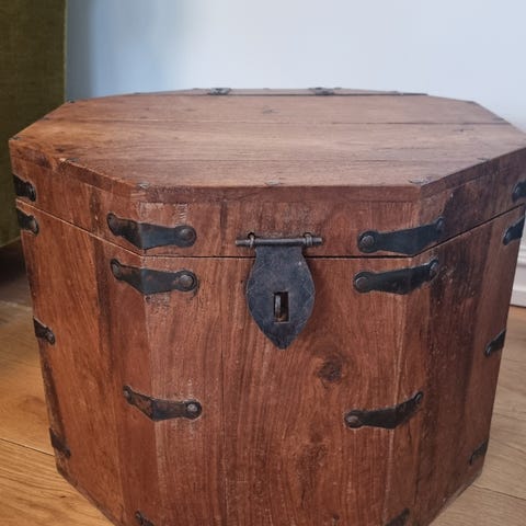 Antik trækiste fra 1762, brun med metalbånd og ruminddeling