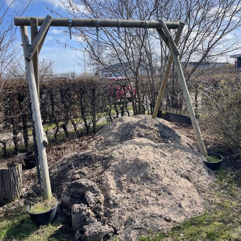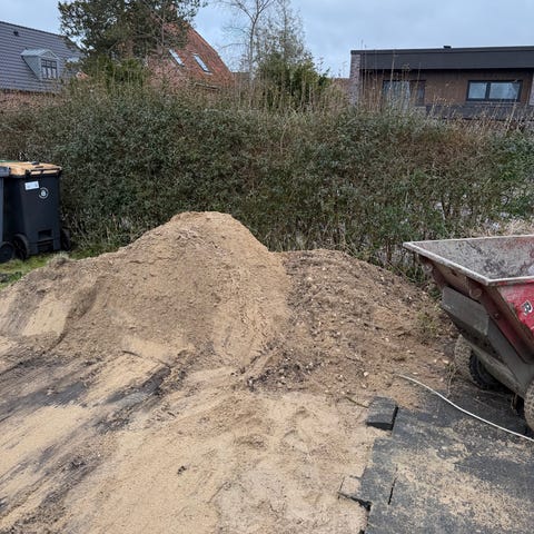 Grus og sand i blandet fraktion, egnet til fx opfyldning, stabilisering eller andre bygge- og anlægsopgaver, hvor en grov sand-/grusblanding kan anvendes. Mængden fremgår af billederne, og materialet ligger løst på jorden klar til afhentning.