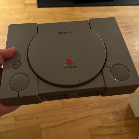 PlayStation 1 med controller, memory card og kabler