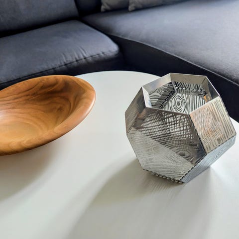 Tom Dixon lysestage i kobberfarvet metal. Geometrisk, facetslebet form med gennemgående perforeret mønster, der lader lyset skinne igennem siderne. Velegnet til fyrfadslys eller små stearinlys og som dekorativt element i indretningen.