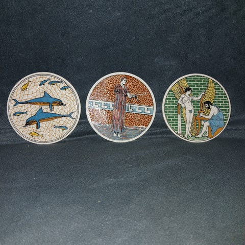 2 små platter fra Grækenland. Håndlavet af Knossos Ltd. i keramik og viser temaer fra græsk mytologi. Små brugsspor. Sælges samlet. Diameter 9 cm.