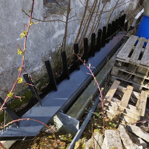 God udendørs trappe i metal med trin af træ. Sælges da den ikke kan bruges til ny terrasse.