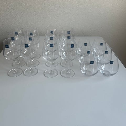 Lyngby Glas drikkeglas i klart glas med facetslebet, mønstret design. Sættet består af 34 høje glas, der egner sig til vand, sodavand eller andre kolde drikke. 11 stk lidt mindre medfølger. Glasset er gennemsigtigt med dekoration i bunden og langs siderne, som giver et klassisk udtryk. Velegnet til daglig brug eller til borddækning ved sammenkomster.