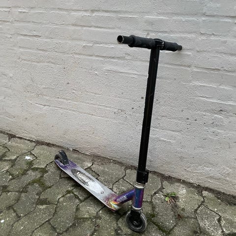 Stunt løbehjul fra Story i sort og lilla. Lidt slid på malingen, mangler grips på styret. Kører ellers fint og hjulene er i ok stand.