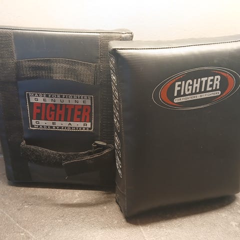 Fightersport boksepads/pletpuder i sort og rød. Sættet består af to håndholdte pads med buet form og polstret slagflade. Bagsiden har justerbare stropper til fastgørelse om hånden for bedre kontrol under træning. Velegnet til bokse- og kampsportstræning, teknikøvelser og konditionstræning med makker.