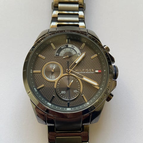Tommy Hilfiger satm/165 feet water resistant. herreur med kronograf og stållænke. Uret har rund urkasse med mørk skive og flere subdials. Æske medfølger