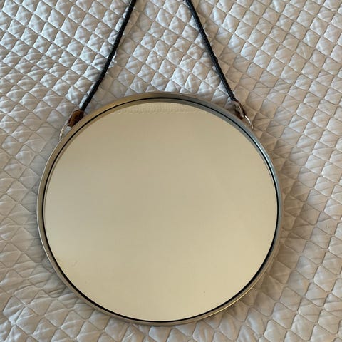 Ø58. Fint spejl, ikke brugt i flere år. Har lidt patina nederst i rammen og en smule på bagkanten der skal hænge op af væggen.