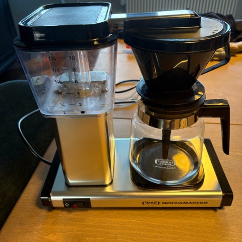 Kaffemaskine fra Moccamaster med glaskande og varme i plade, så kaffen holdes godt varm på kanden.