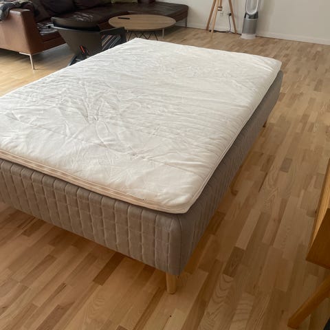 IKEA seng med træramme. Enkelt sengestel i lyst træ med sengehest langs siderne. Madras medfølger ikke