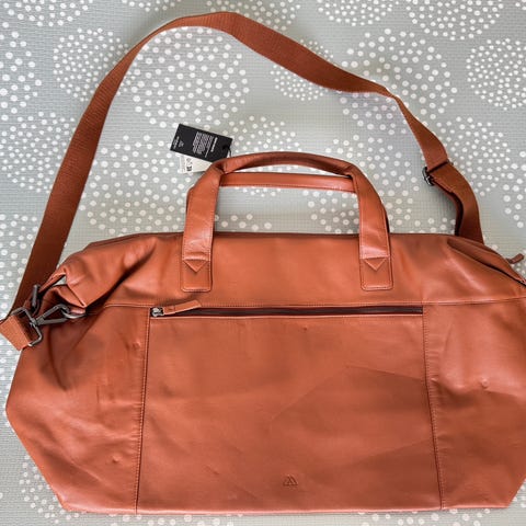 Flot taske i minimalistiske design med en vandret lynlåslomme på forsiden og et diskret, præget logo i det nederste hjørne.