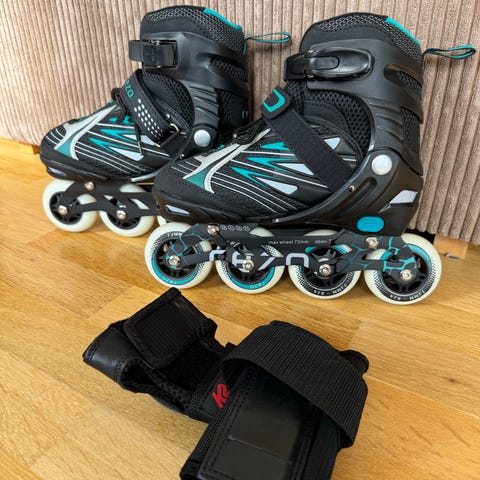 Rezo rulleskøjter til børn/voksne model med justerbar størrelse ca. 36-40. Rulleskøjterne er i hård plastikskal med sort yderside, hvid ankelstøtte og lyserøde detaljer. Inderforet er polstret og lyserødt for øget komfort. Lukkesystem med remme og spænder, der giver mulighed for at tilpasse pasformen omkring fod og ankel. Understel med fire hjul i lyserød farve på hver skøjte, egnet til rulleskøjteløb på jævne underlag. Velegnet til børn/voksne med skostørrelse omkring 36-40 der ønsker justerbare rulleskøjter til leg og motion.