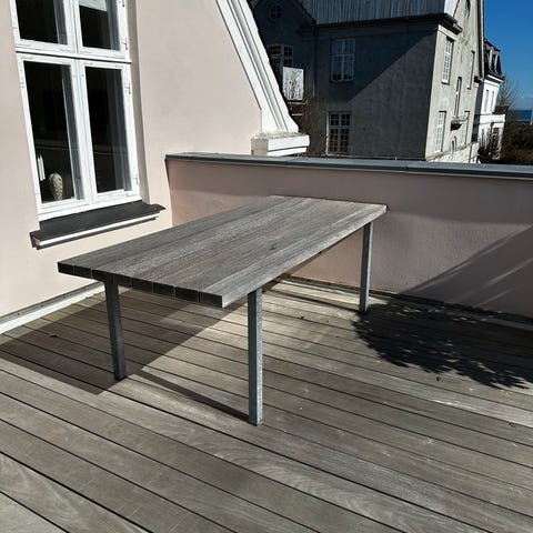 Brugt altanbord fra Altanbutikken.dk "Alberte teak gateleg" på 130 x 70 cm eller halvt 77 x 70 cm. Bordpladens overflade er renset, slebet og olieret start april 2026, så den er lige så rart at røre ved og modstandsdygtig som fra ny.