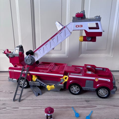 Paw Patrol redningsubåd legetøj i rød plast med gule og hvide detaljer. Legetøjet forestiller en ubåd/flyver fra Paw Patrol-universet og har gennemsigtig blå cockpitklap, der kan åbnes. Egnet som rollelege-legetøj for børn, der kan lide Paw Patrol og køretøjer til redningsmissioner.