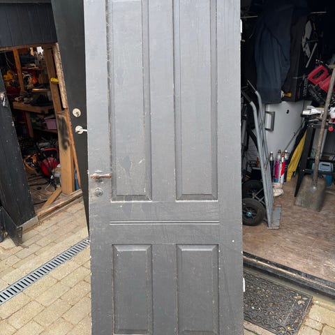 Yderdør i træ med lodrette brædder og sort overflade. Døren har en lille kvadratisk rude øverst og er udstyret med låsekasse og greb. Velegnet som yderdør til fx skur, udhus eller sekundær indgang. Mål 191x95 cm