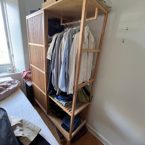 Nordkisa garderobeskab. Som nyt. Skal hentes på Østerbro (er ikke samlet). Alle detaljer og mål er her: https://www.ikea.com/dk/da/p/nordkisa-abent-garderobeskab-med-skydedor-bambus-00439468/