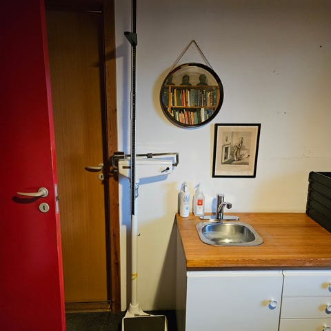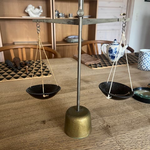 Da den var i brug i 1970’erne var den underlagt kontrol af datidens 'Justervæsen', som kom hvert andet år og kontrollerede den. Den vejer stadig fint 😊. Flot stykke møbel. Perfekt til et udstillingsvindue. Eller til at veje baby👍