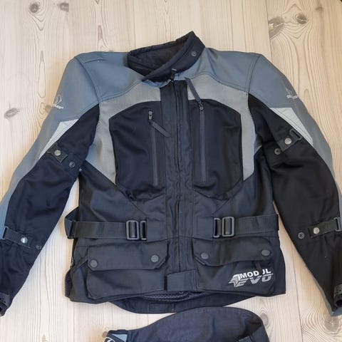 Motorcykeljakke i blå og sort. Jakken har flere udvendige lommer og justerbare stropper i livet. Egnet som yderjakke til motorcykelkørsel. Str. L