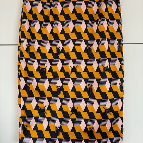 H&M nederdel i str. 38 til kvinder. Nederdelen er fremstillet i en vævet viskose der falder løst, den er helforet med polyester. Mønstret i beige og sort. Knapper bagpå er slået i sort. Egnet til hverdagsbrug eller mere pæne anledninger afhængigt af styling.