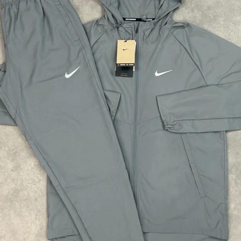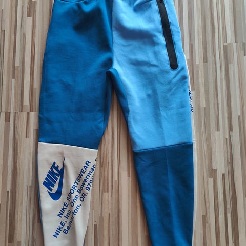 Nike træningssæt til herre i størrelse M. Sættet består af træningsjakke med gennemgående lynlås og matchende træningsbukser. Farvekombination i blå, hvid og grå med Nike-logo på både jakke og bukser. Materiale: 100 % polyester. Velegnet til fitness og anden træning samt hverdagsbrug.