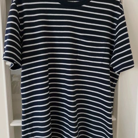 Lindbergh White T-shirt til herre i størrelse L. T-shirten er i bomuld og har brede, horisontale striber i flere farver, herunder mørkeblå, hvid og rød. Klassisk rund halsudskæring med kontrastkant. Egnet som hverdags-T-shirt eller til afslappet brug.