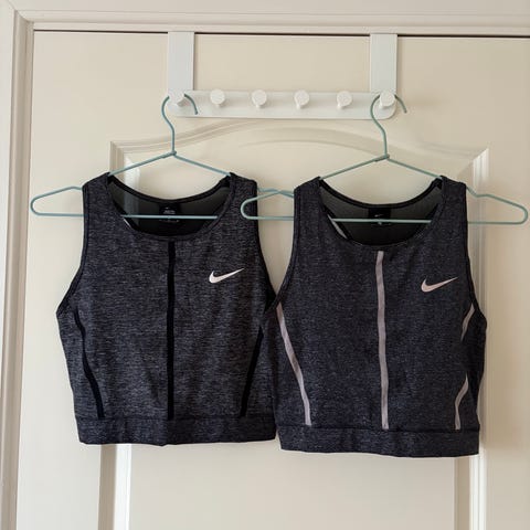 Nike Air sports-bh i størrelse S. Bh’en er lilla med hvidt Nike Air-logo print over hele stoffet. Justerbare stropper og krydsryg for bedre pasform. Fremstillet i let, åndbart materiale med Nike Dri-FIT teknologi, som leder sved væk fra kroppen. Velegnet til fitness og anden træning.