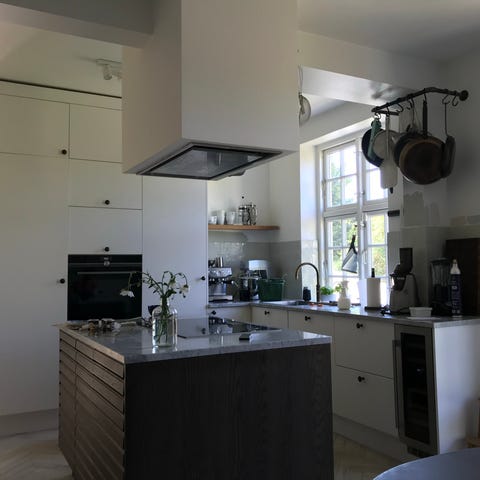 Invita Køkken med underskabe, overskabe og skuffer i lys farve. Marmor bordpladen i sort farve.
