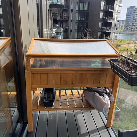 Juliana drivhus plantebord med integreret vandbakke i sort. Bordet monteres på drivhusets sider og giver ekstra arbejds- og opbevaringsplads til potter og planter. Vandbakken kan bruges til undervanding eller opsamling af overskydende vand. Velegnet til brug i mindre og mellemstore drivhuse, fylder 2 sektioner