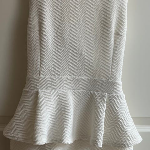 Karen Millen kjole i størrelse M. Kjolen er hvid og fremstillet i bomuld. Modellen har rund hals og et enkelt, tætsiddende overstykke med struktur i stoffet samt nederdel med diskrete plisserede detaljer. Egnet som hverdagskjole til dame i en neutral farve, der kan bruges alene eller styles med jakke eller cardigan.