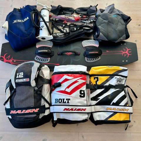 Kitesurf sæt – 4 kites + bar + tasker – klar til brug