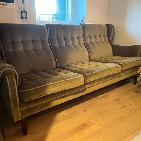 3 personers sofa i velour-look. Har stået på gæsteværelset men vi har behov for en sofa man kan sove i, og dette er klart en sofa man sidder i. Mega fed og solid. Jeg kender ikke til mærket, da den er købt på auktion. Ingen mærker eller skader.