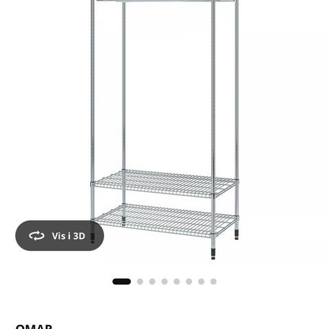 IKEA Omar garderobestativ i metal med hylde øverst og bøjlestang under. Åben konstruktion velegnet til opbevaring af tøj, jakker og sko i soveværelse, entré eller opbevaringsrum. Stativet står på gulvet og giver mulighed for både hængende og liggende opbevaring.